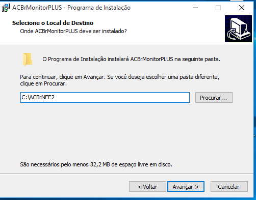 Execute a instalação e vai seguindo os passos, é bastante intuitivo. A única tela que merece uma atenção melhor é a abaixo, que seta a pasta de instalação do acbr. Vou deixar tudo como uso. Então a pasta de instalação será c:\acbrnfe2 Quando terminar de instalar, vai abrir a tela principal, é onde você irá configurar o acbr. Observe que existem várias opções no menu, neste tutorial só usaremos dois (Monitor e DFe) Monitor eh onde configura como o monitor vai ser comportar, como fará o monitoramento, e o DFe onde são configuradas opções referentes a NFe e NFCe.