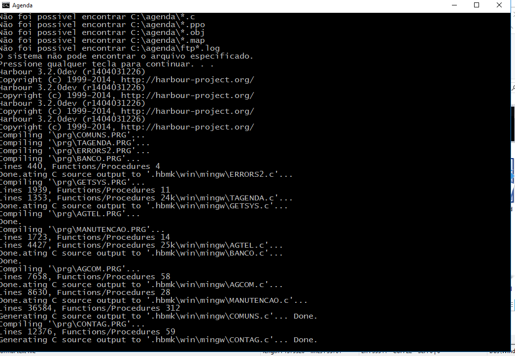 De vez em quando ele trava na compilação, não gera o .exe. Não dá nenhum erro, apenas trava depois de compilar os prgs, mas antes de finalizar, sem gerar o .exe.