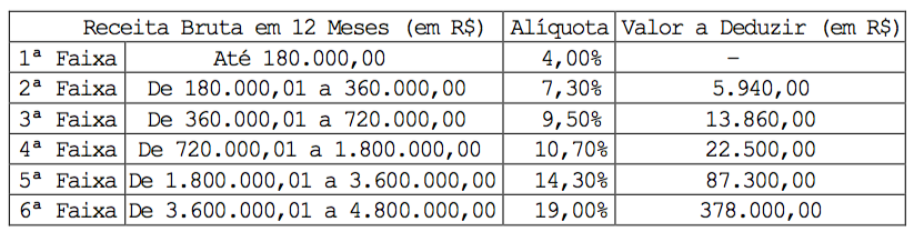 Veja como será o cálculo para o Simples Nacional a partir de 01/01/2018 para saber qual alíquota aplicar sobre o faturamento, conforme artigo 18 da nova lei: