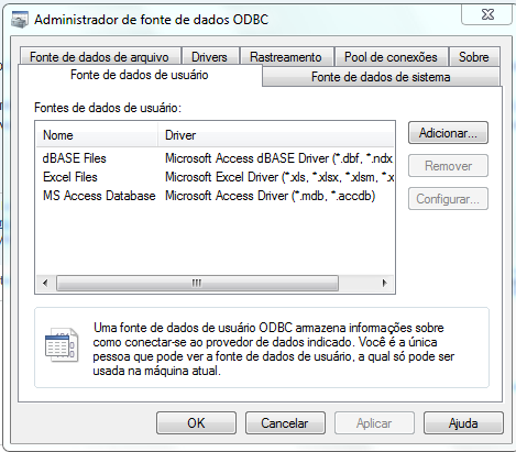Depois entre em Fontes de Dados ODBC e verifique se tem o Driver Microsoft Access Driver (*.mdb) instalado.