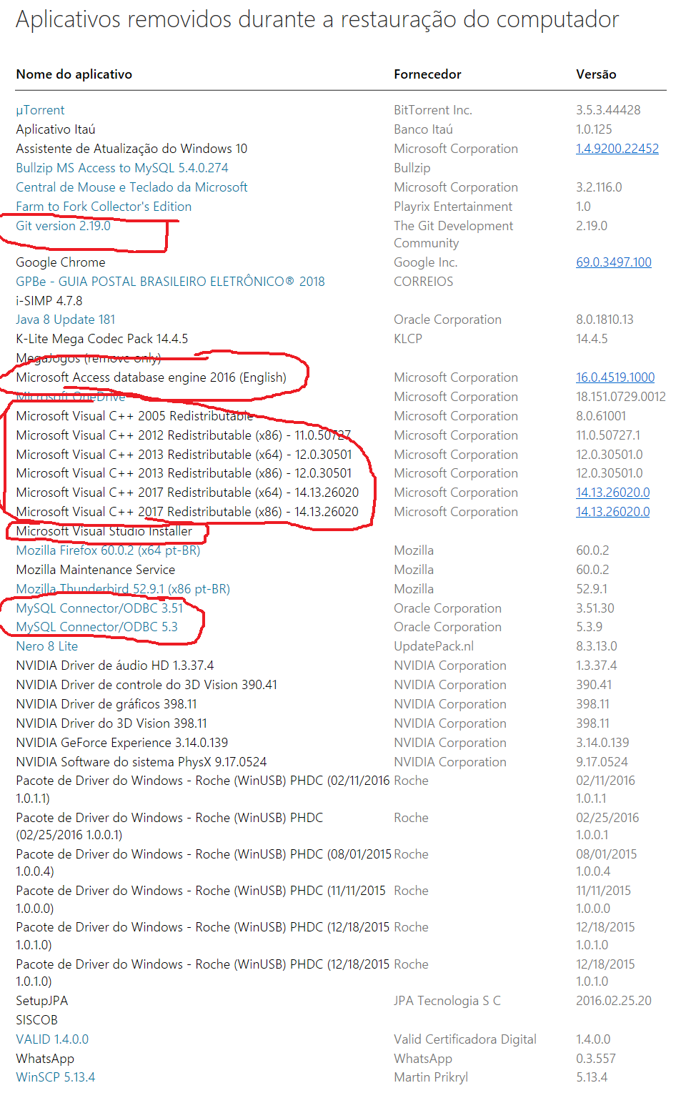 Ao restaurar Windows, os run-times do MSVC são removidos., além de outras coisas, como o ODBC MySQL.