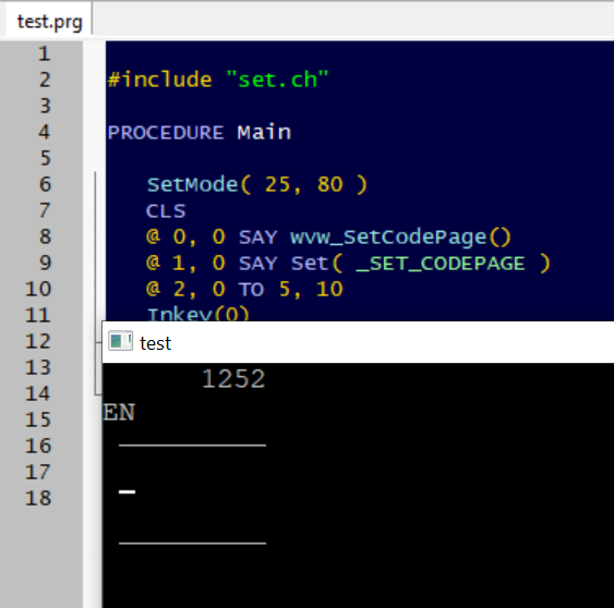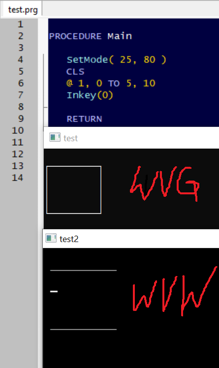 Hoje na continuação da migração do xHarbour 1.00 para Harbour 3.4 (Viktor), notei uma falha no @ ... TO e função DispBox(), onde era esperado que fosse desenhado uma caixa com linha simples e o erro acontece que as linhas verticais perdem as coordenadas passadas.