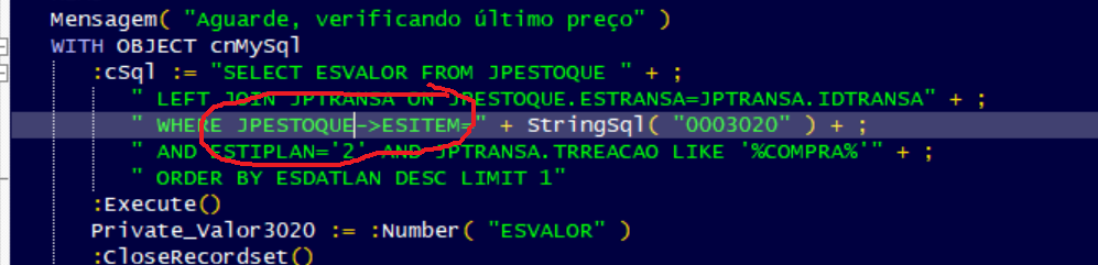 "WHERE ESITEM=" + StringSql( cItem ) + " AND ESTIPLAN='2' AND JPTRANSA.TRREACAO LIKE '%COMPRA%' " + ;