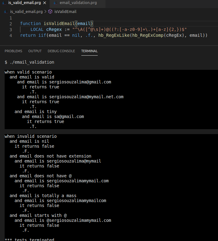 Segue a imagem da function isValidEmail e o resultado dos testes. :-D