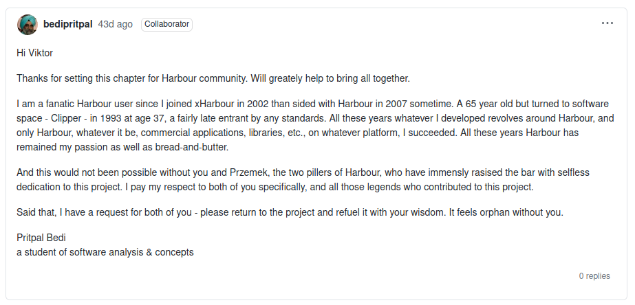 Depois que o Viktor migrou o Harbour para o GIT, não tem mais essa história de 1 programador só, todo mundo faz forks e mexe e manda para a arvore principal as correções e atualizações.