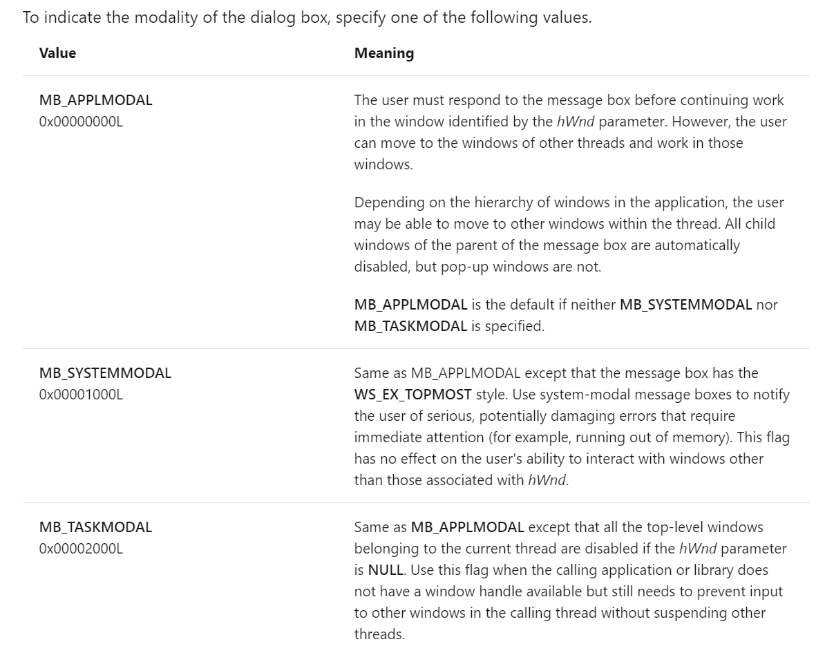 É... porque.... se a dúvida é sobre Messagebox() do Windows, a resposta deve estar na documentação de Messagebox.