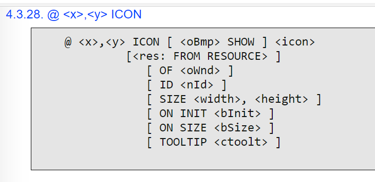 #xcommand @ <x>,<y> ICON [ <oIco> SHOW ] <icon> ;