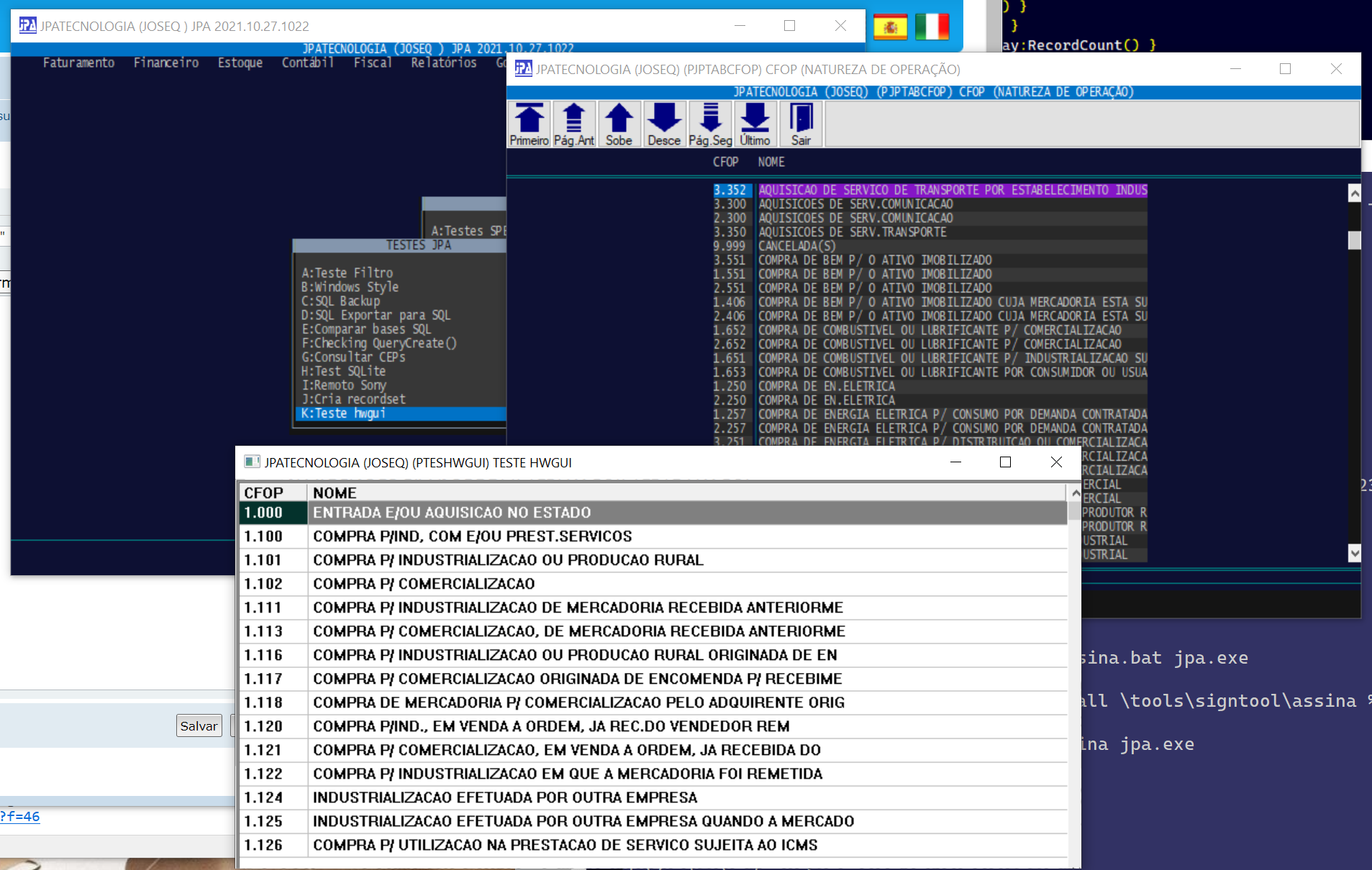 HARBOUR 3.2, HWGUI 2.23 B7, SEFAZCLASS, PDFClass, ADO + MariaDB/MySQL, RMChart, Python + FASTAPI , Android Kotlin