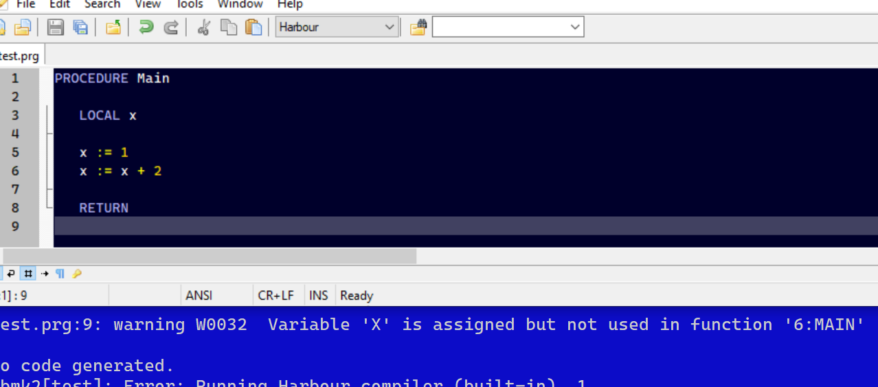 test.prg:10: warning W0032 Variable 'X' is assigned but not used in function '7:MAIN'