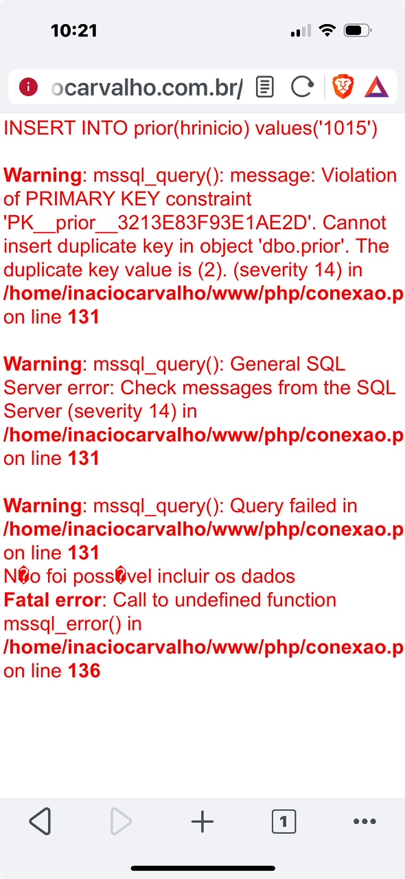 Depois que mudei uma tabela para o SQL Server, passei a ter eventualmente um erro estranho num Insert no PHP. Vejam a tela em anexo.