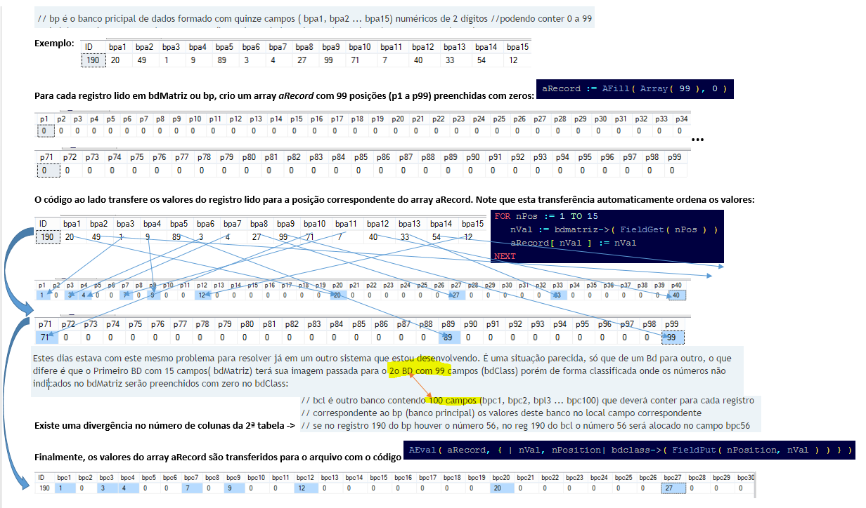 Linha 6: aRecord[ nVal + 1 ] := nVal // como o campo 1 é o ID, a posição na matriz sempre será uma a frente. Por exemplo: Se o valor do campo bpa[x] for 1, nVal será 1, mas para que seja gravado no campo bcp1, tem que ser a posição nVal+1. Se não fizer isso, irá gravar no campo 1 que é o ID. Como os números não se repetem, fica correto.