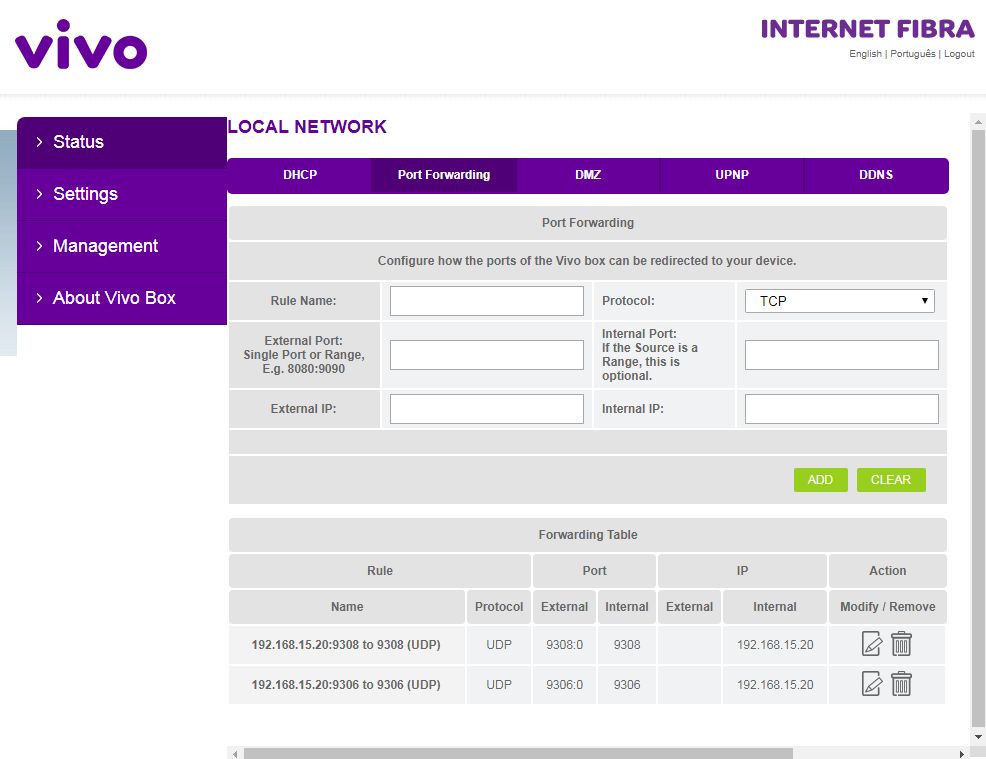 Ao tentar configurar o roteador, fazendo o login e indo na opção Port Forwarding (redirecionamento de porta), vejo essa tela: