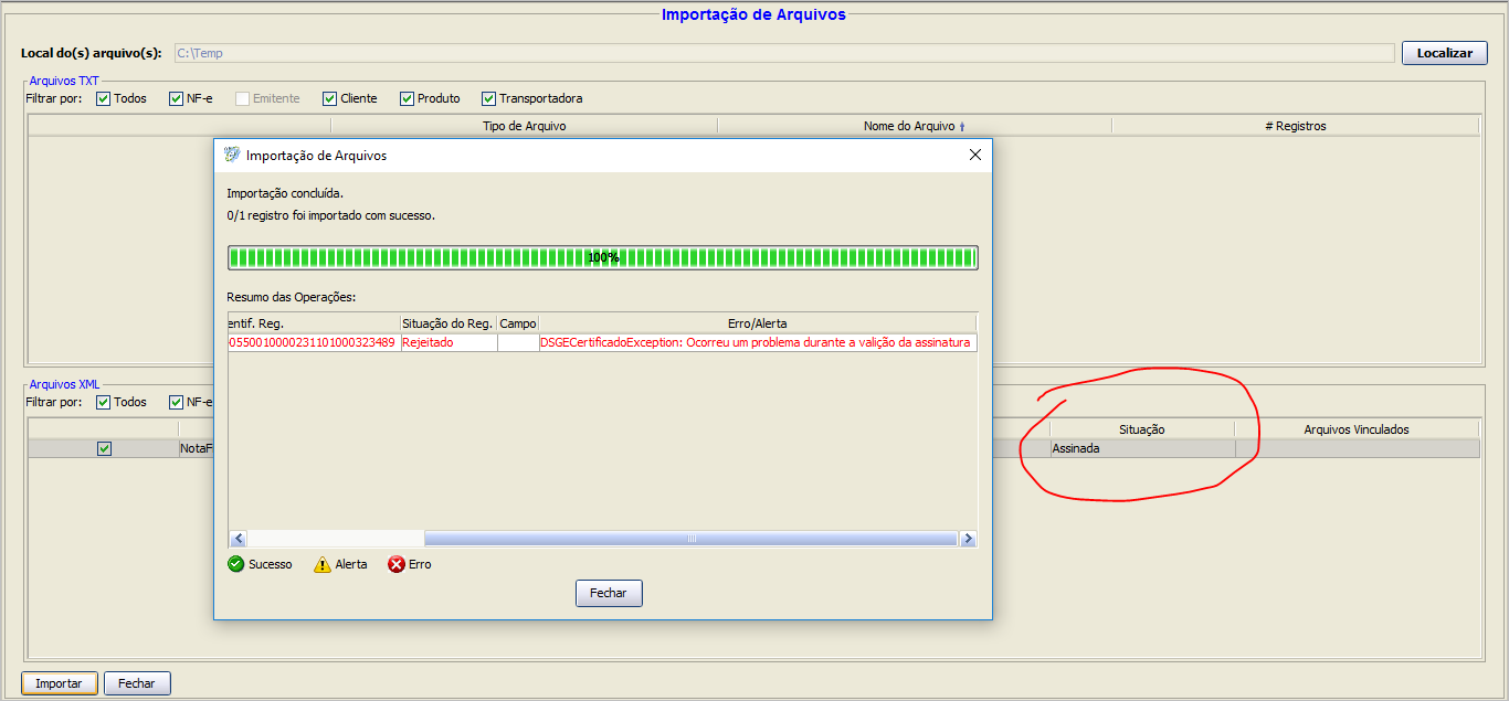 Vai acusar assinatura inválida, mas vai importar normalmente, como se fosse o txt.
