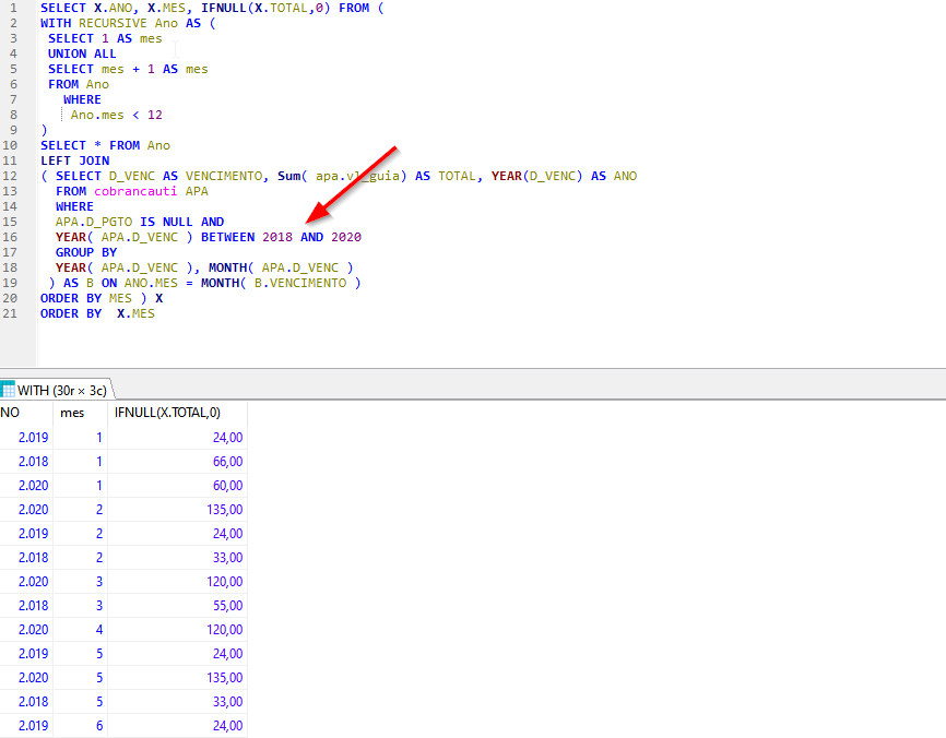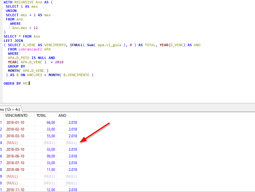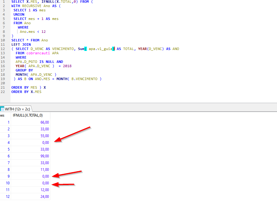 SELECT X.ANO, X.MES AS MES, IFNULL(X.TOTAL,0) AS TOTAL FROM (