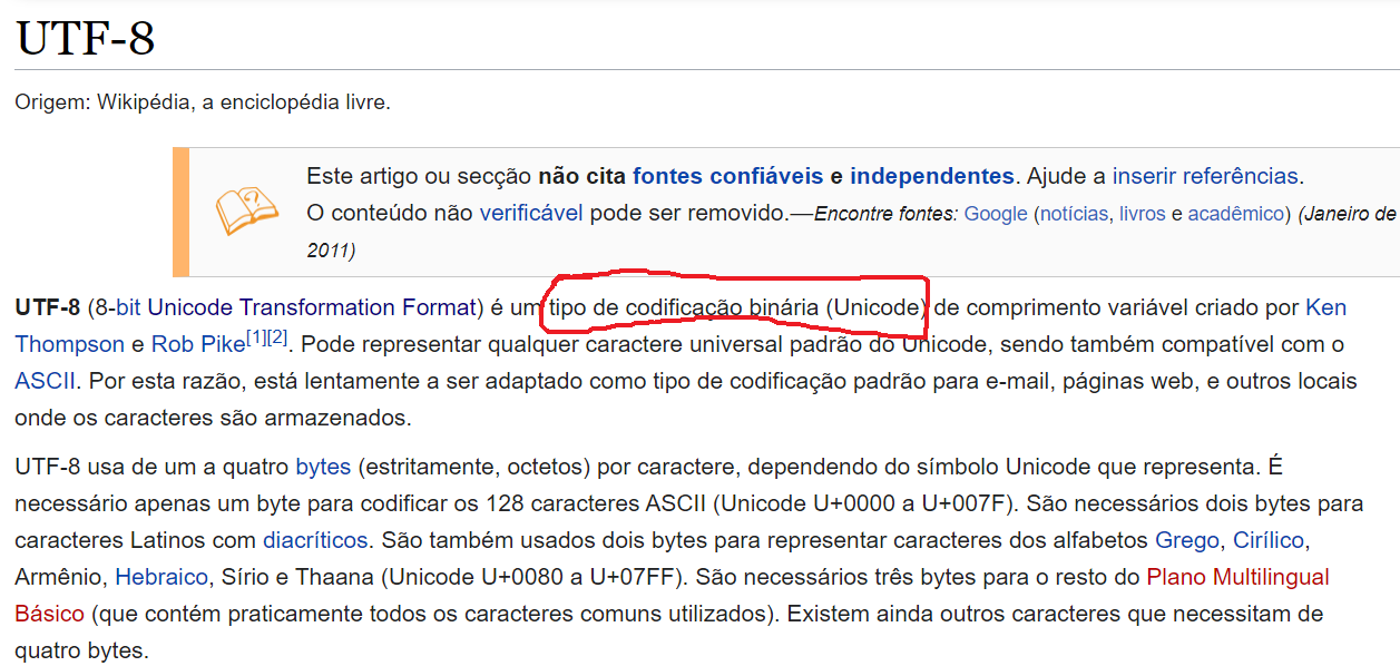 Saudações,Thus was invented the brilliant concept of UTF-8. UTF-8 was another system for storing your string of Unicode code points, those magic U+ numbers, in memory using 8 bit bytes. In UTF-8, every code point from 0-127 is stored in a single byte. Only code points 128 and above are stored using 2, 3, in fact, up to 6 bytes.