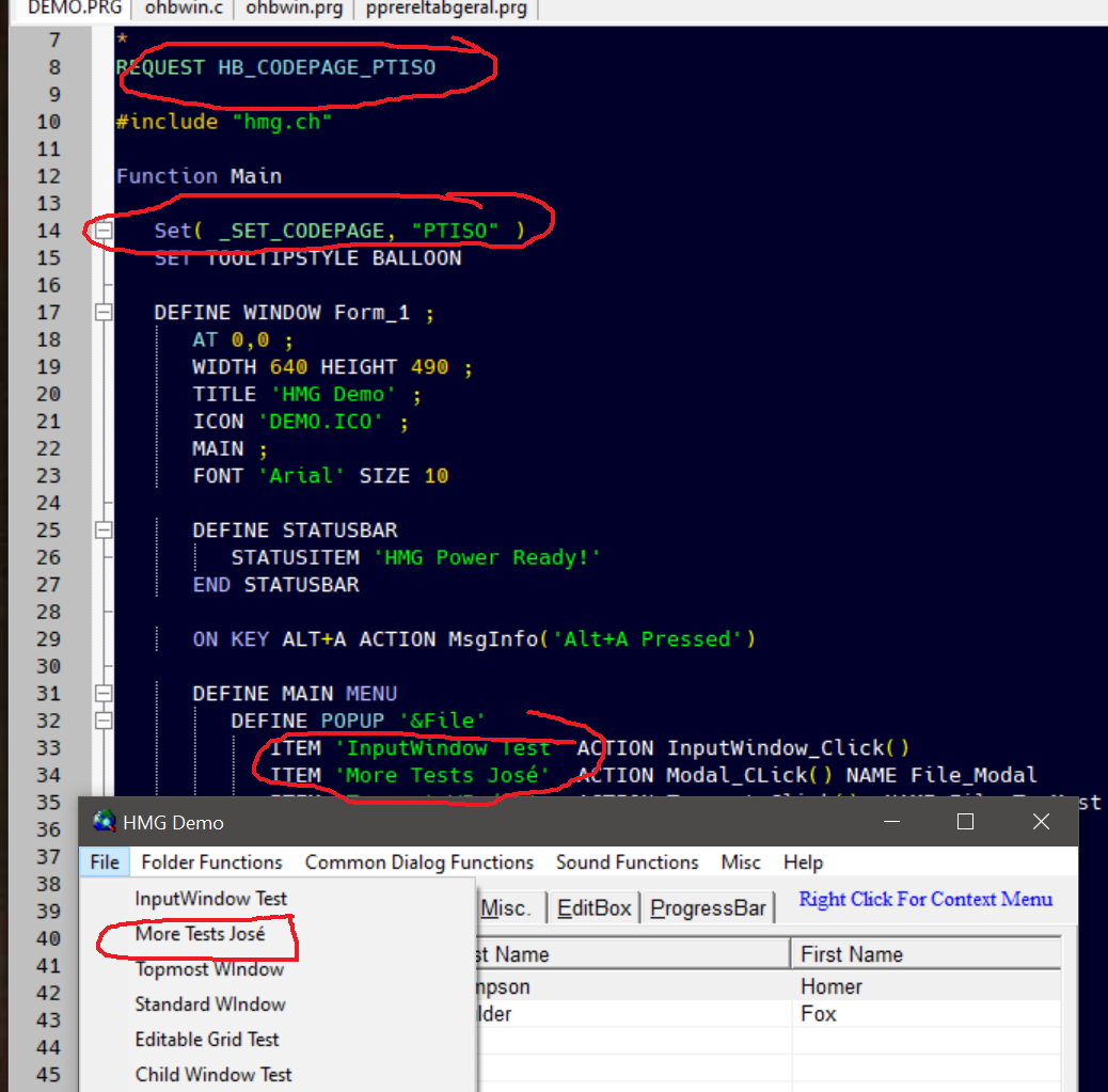REQUEST HB_CODEPAGE_PTISO //Aqui a pagina de código -> afeta tudo, tela e base de dados. a tal ISO85x(latin, unicode etc, no windows)