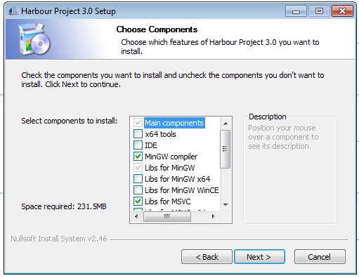 Ao iniciar a instalação da harbour, percebi que alguns recursos estão desmarcados como x64 tools, dll´s for x64 e outras mais, segue print em anexo.