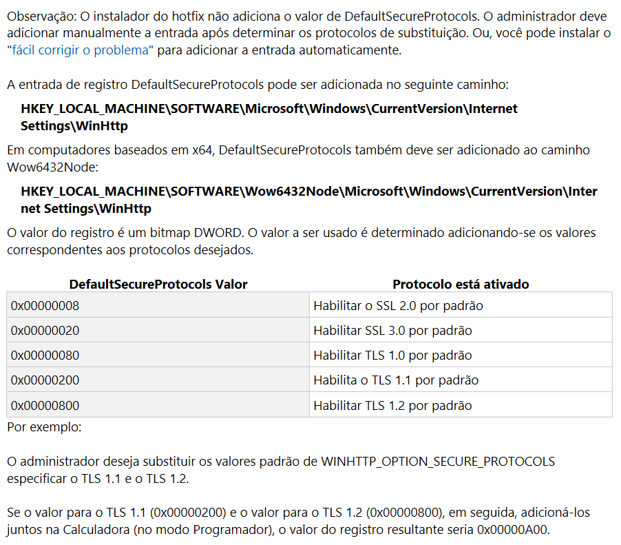Depois de fazer as atualizações, rodar o programa de correção, que faz a mudança no registro colocando TLS 1.2 como automático.