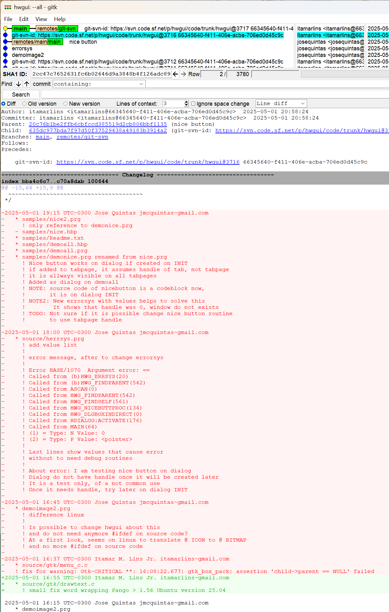 Note que a sua alteração no final da primeira janela não aparece no changelog atual.