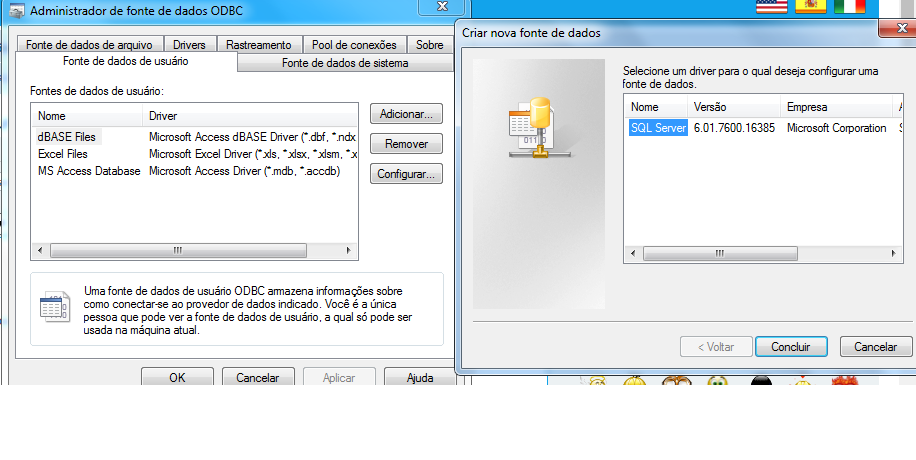 As primeiras partes foram instaladas normalmente, mas, quando chegou na configuração do ODBC, não aparece o MySQL. Veja no anexo.