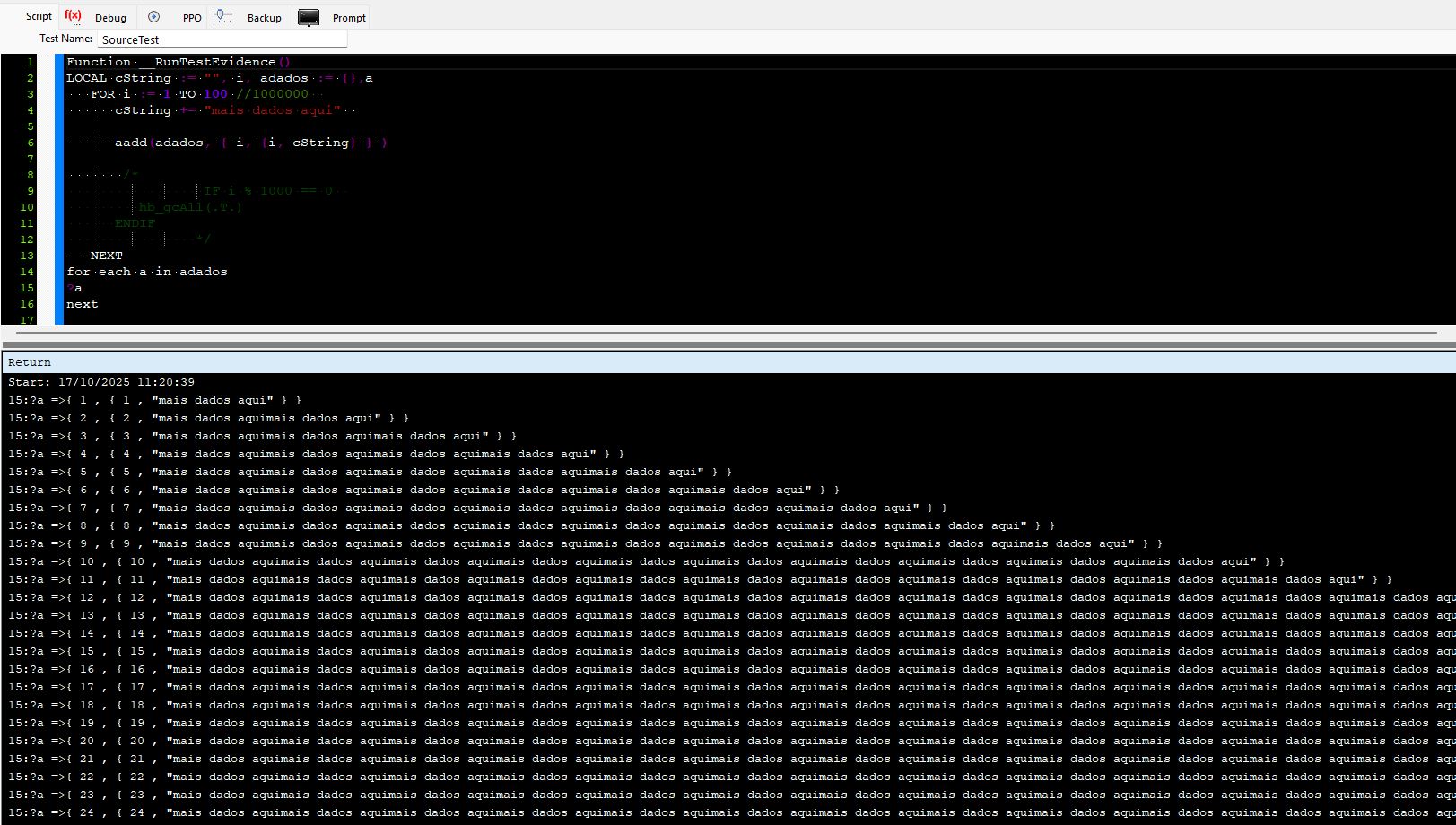 Executem o código abaixo e veja se ocorre o erro Unrecoverable error 9009: hb_xrealloc can't reallocate memory