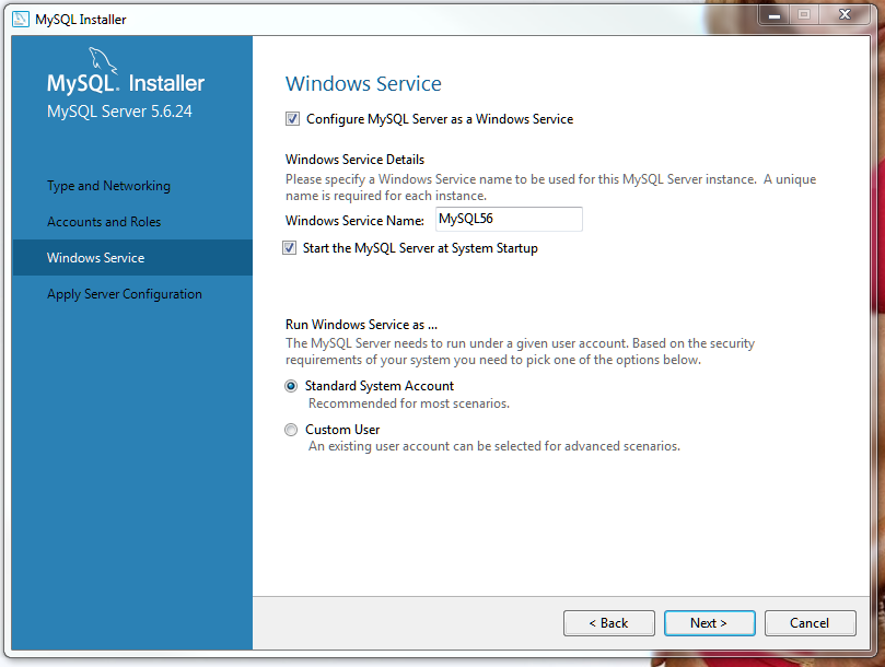 Já vai instalar o MySQL como serviço, iniciar automaticamente, e se procurar na lista de serviços do Windows, vai se chamar MySQL56.
