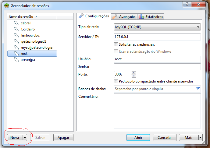 Agora acessar o servidor, só escolher NOVA, e colocar os dados do servidor que instalamos.