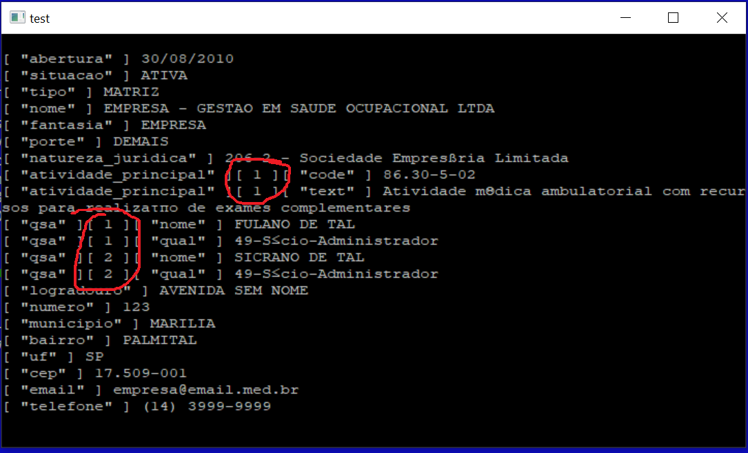 txt := '{ "abertura": "30/08/2010", "situacao": "ATIVA", "tipo": "MATRIZ", "nome": "EMPRESA - GESTAO EM SAUDE OCUPACIONAL LTDA", "fantasia": "EMPRESA", "porte": "DEMAIS", "natureza_juridica": "206-2 - Sociedade Empresária Limitada", "atividade_principal": [ { "code": "86.30-5-02", "text": "Atividade médica ambulatorial com recursos para realização de exames complementares" } ], "qsa": [ { "nome": "FULANO DE TAL", "qual": "49-Sócio-Administrador" }, { "nome": "SICRANO DE TAL", "qual": "49-Sócio-Administrador" } ], "logradouro": "AVENIDA SEM NOME", "numero": "123", "municipio": "MARILIA", "bairro": "PALMITAL", "uf": "SP", "cep": "17.509-001", "email": "empresa@email.med.br", "telefone": "(14) 3999-9999", "data_situacao": "30/08/2010", "cnpj": "12.245.678/0001-10", "ultima_atualizacao": "2023-03-11T23:59:59.000Z", "status": "OK", "complemento": "", "efr": "", "motivo_situacao": "", "situacao_especial": "", "data_situacao_especial": "", "atividades_secundarias": [ { "code": "00.00-0-00", "text": "Não informada" } ], "capital_social": "4000.00", "extra": {}, "billing": { "free": true, "database": true } }'