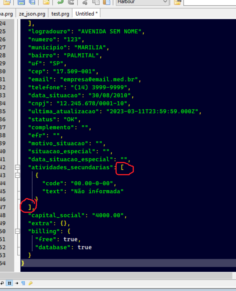 Boa tarde, entrando no mundo Json. Peguei exemplos, está até funcionando a contento. Só não consegui pegar atividade_principal, qsa e atividades _segundárias.