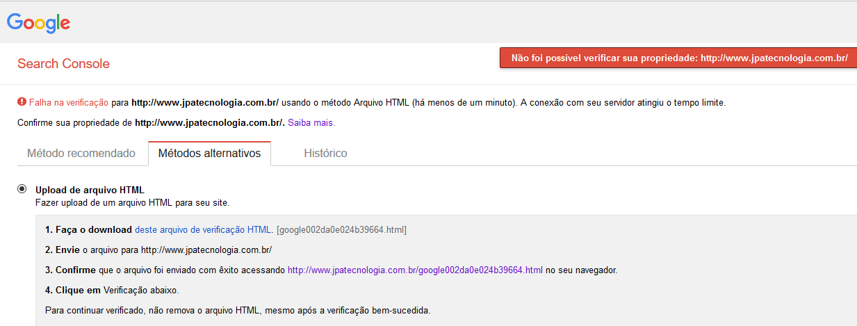 Um outro detalhe, que não sei se pode causar algum problema, é quando se digita o endereço do seu site no navegador (www.jpatecnologia.com.br) e pressiona enter, automaticamente o endereço muda para www.jpatecnologia.com.br/html/index.htm. Então tudo indica que os arquivos HTML do seu site está em uma outra pasta chamada /html/.