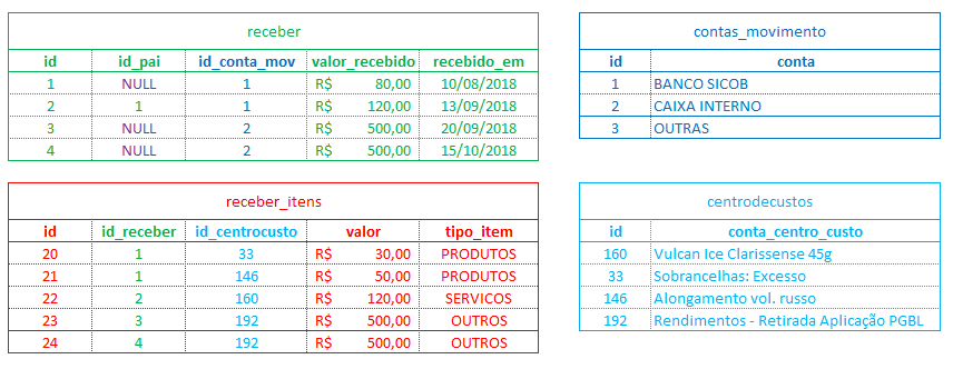 A tabela "receber_itens" é uma tabelha filha relacionada com a tabela "receber", ela contém os itens que compõe o faturamento, pode ser a venda de produtos, serviços ou outros recebimentos (coluna "tipo_item"), nela também temos a coluna id_centrocusto relacionada a tabela "centrodecustos" para sabermos no fechamento do mês no fluxo de caixa de onde está vindo mais o dinheiro, se é de vendas de produtos, serviços, etc.