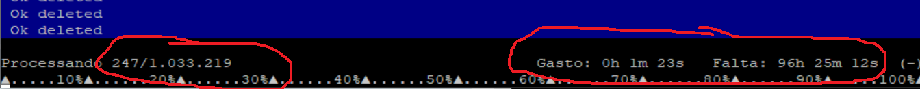 Agora alterei pra excluir 200 por vez, reduziu pra 2 horas.