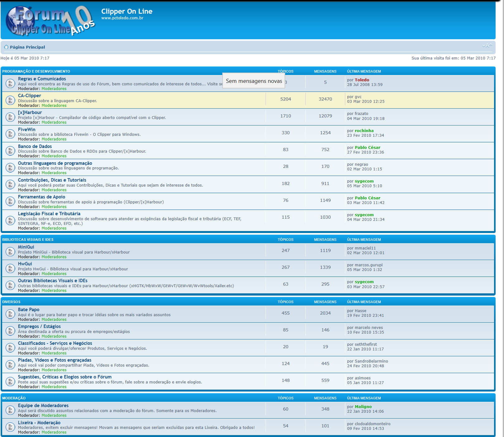 Olha aí. Em 2004 não tinha o tópico Harbour, apenas o xHarbour. Tinha também o famigerado Visual Objects com zero mensagens.