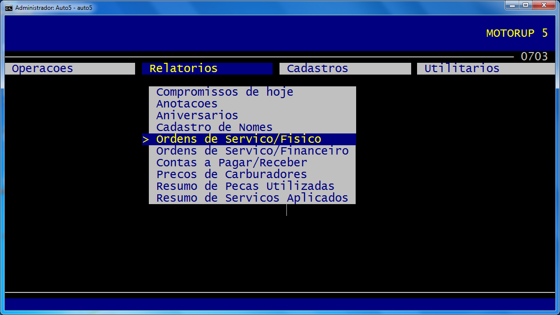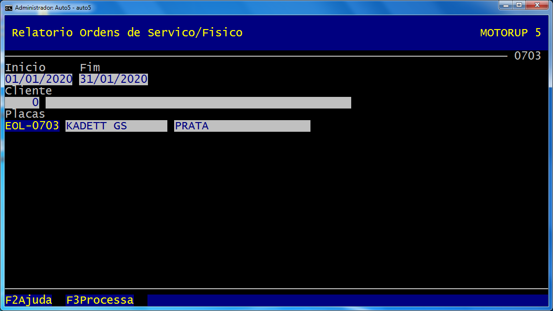 F3 Processa vai gerar (em tela) o relatório de todas as OSs emitidas de 01 a 31/01/2020, do veículo placas EOL-0703, de qualquer cliente. Demora alguns segundos (ufa!), com DBF/NTX. Daí pra frente o usuário imprime em papel, se quiser/precisar.