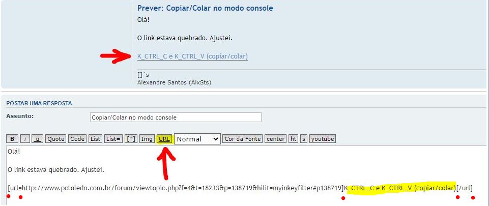 Para inserir um link, use o botão URL, mostrado abaixo e coloque o texto da URL e, se desejar, o texto a exibir, no exemplo "K_CTRL_C e K_CTRL_V (copiar/colar)". Preste atenção no sinal de igual (=) após o início da tag ( [url= ) e na posição dos demais colchetes ( ] e {} ).