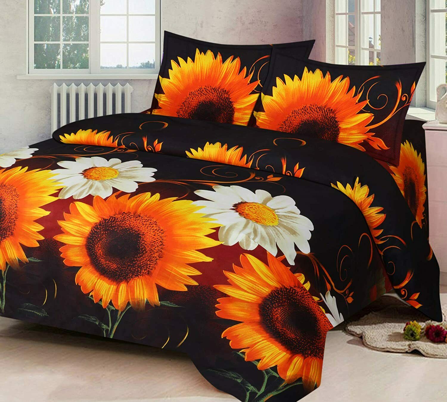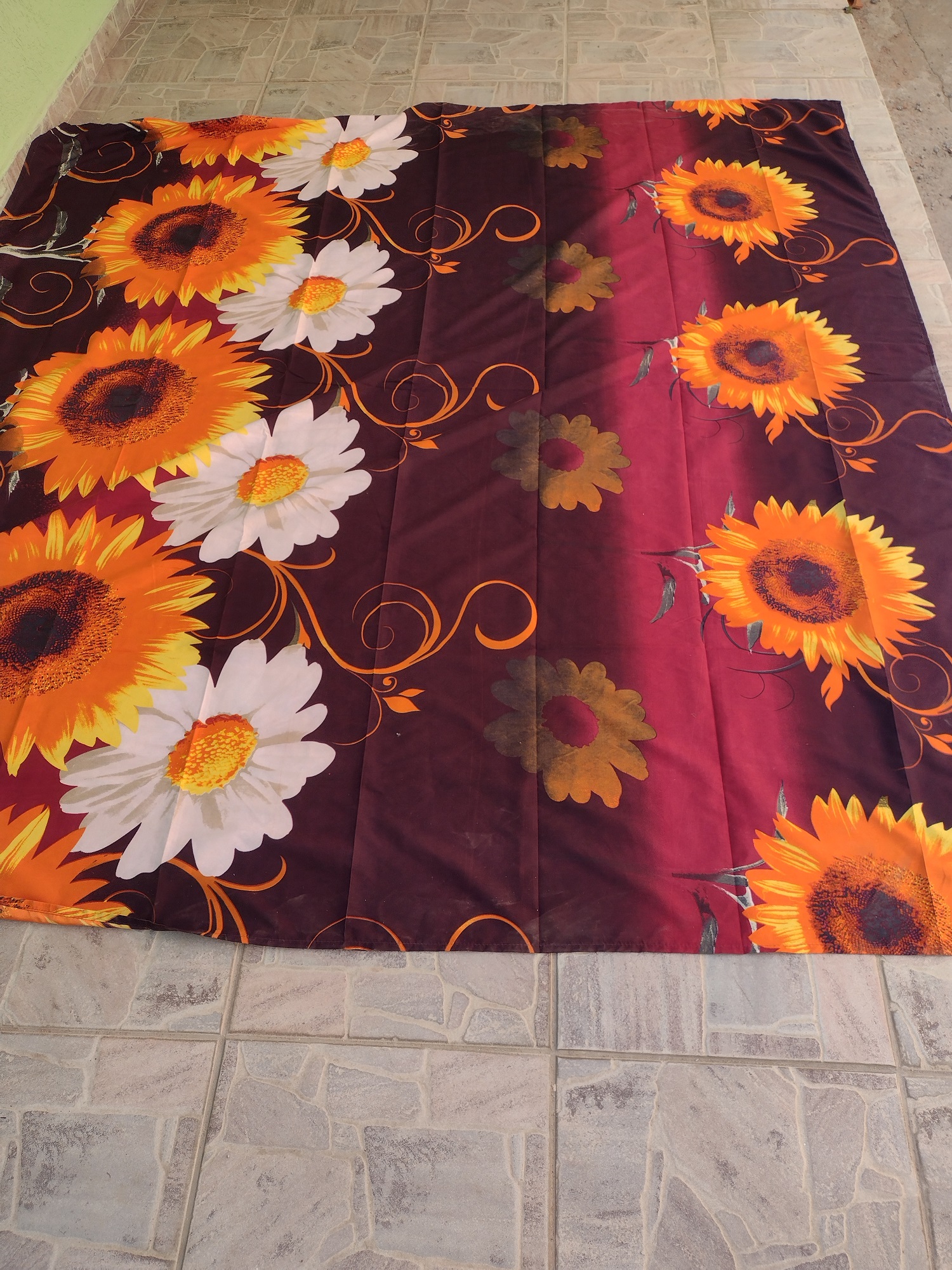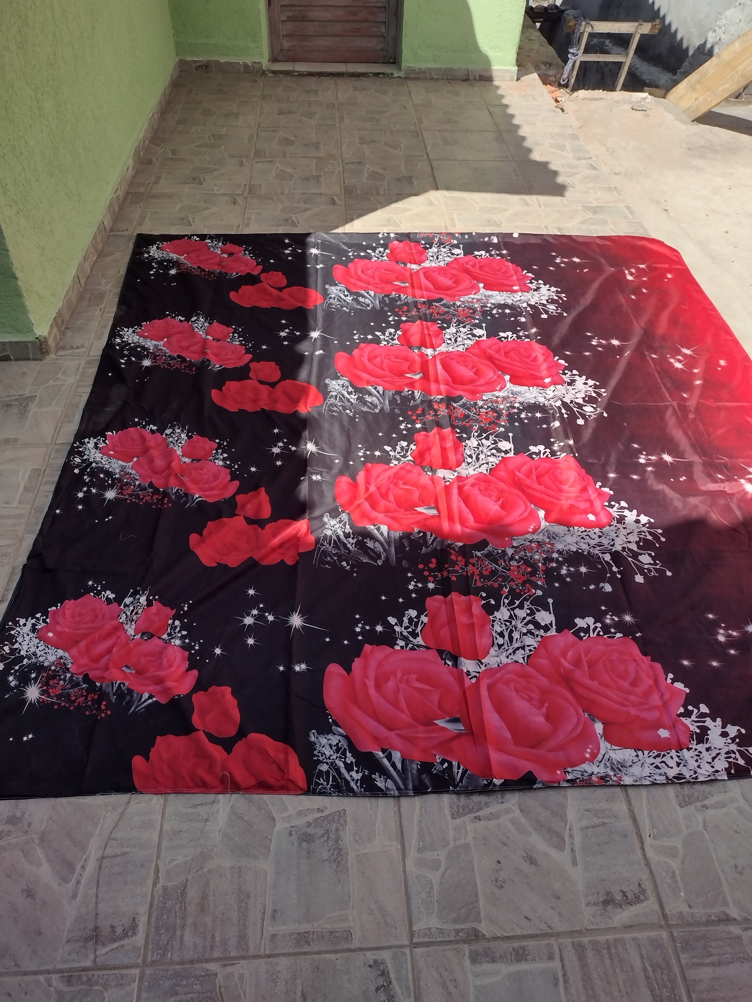 A pintura parece 3D, e que tem rosas encima da colcha.