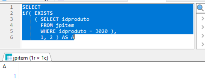 " ( SELECT IF( EXISTS ( SELECT DISTINCT PCPRODUTO FROM JPPRECO WHERE IDPRODUTO=" + ;