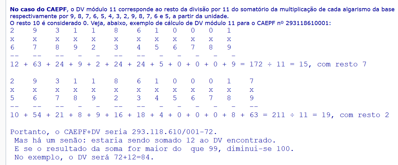 Cálculo do dígito verificador do caepf – cadastro de ativida