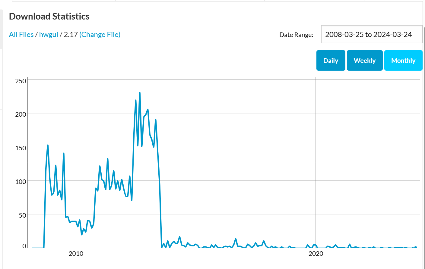 Fonte: sourceforge.net, só escolher período ou versão, mas só mostra downloads de files, não mostra usuários ativos baixando pelo SVN. Quanto mais usuários ativos, menos downloads pra estatítica.