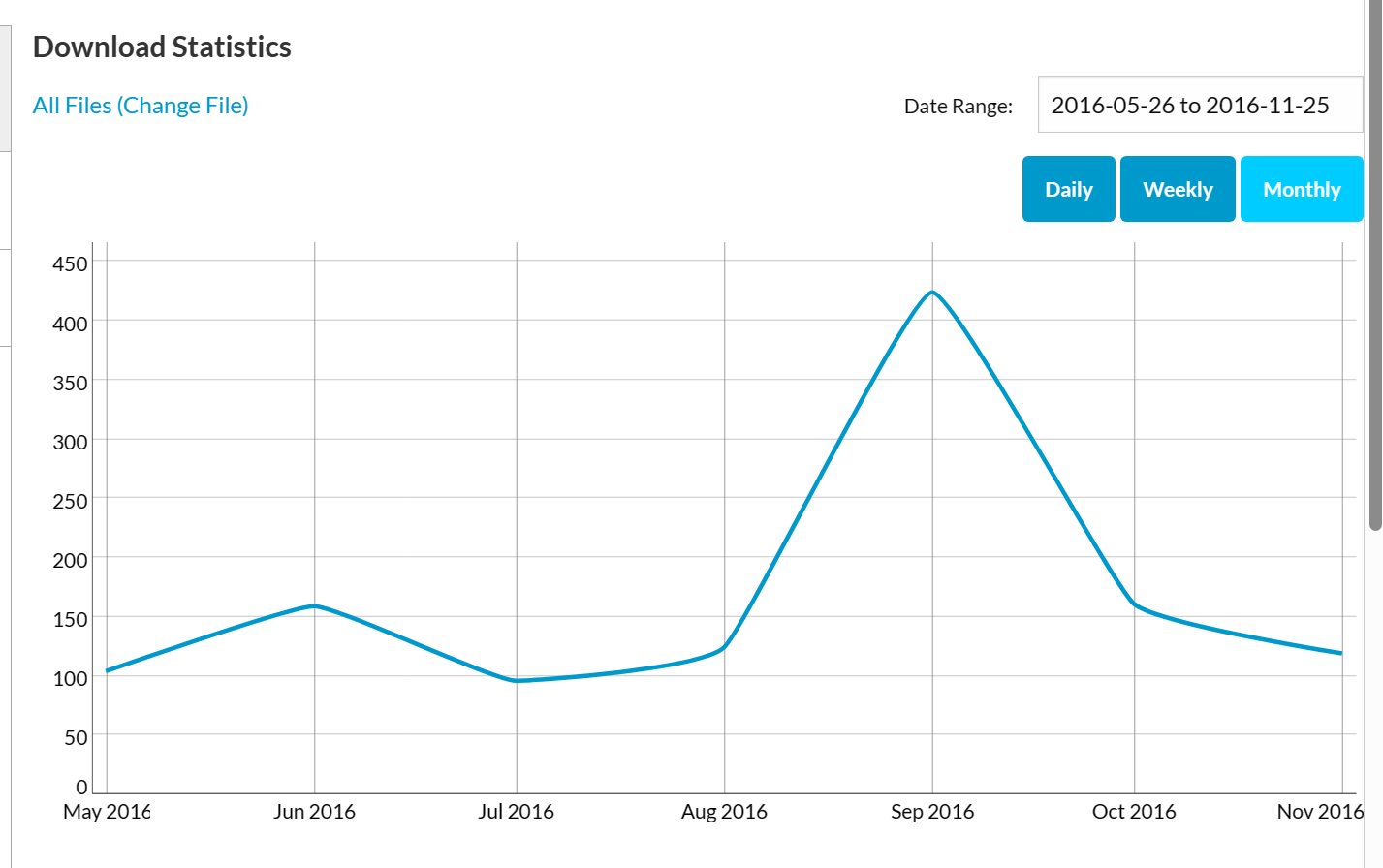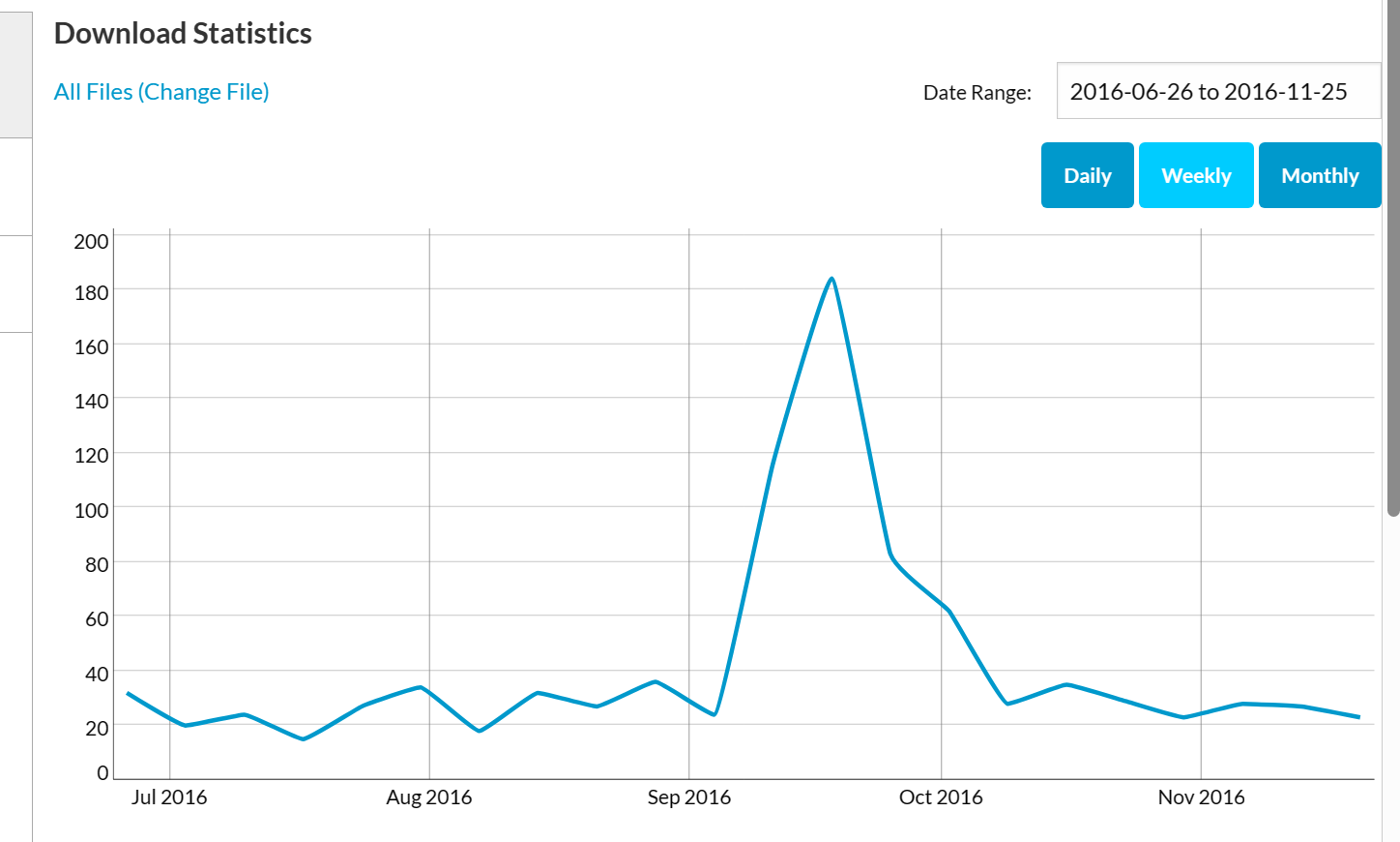 de maio/2016 a novembro/2016, tá lá o pico em setembro, de 400 downloads