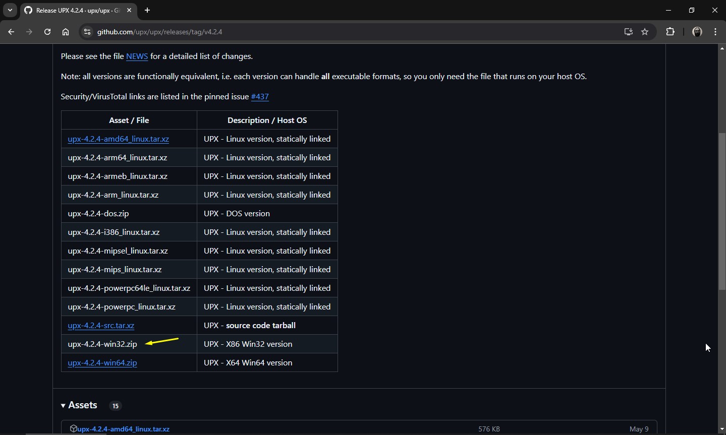 3) Baixei o UPX: https://github.com/upx/upx/releases/tag/v4.2.4 Instalei o UPX descompatando: