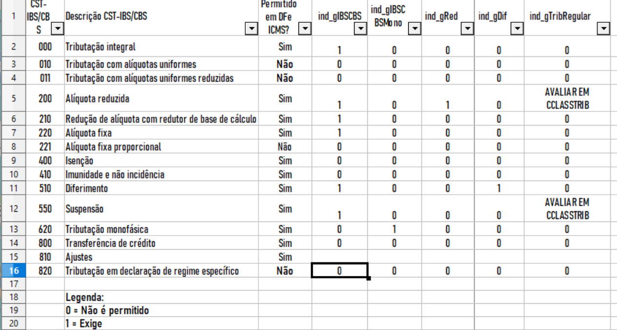 Essa tabela faz parte da tabela principal que é a cClassTrib, os 3 primeiros dígitos do cClasstrib são o CST, e por essa tabela auxiliar ai dá pra saber quais grupos novos eu devo informar no xml, inclusive quais CSTs são passíveis de ser emitido NFe e NFCe.JoséQuintas escreveu: Esta tabela deixa a coisa interessante.