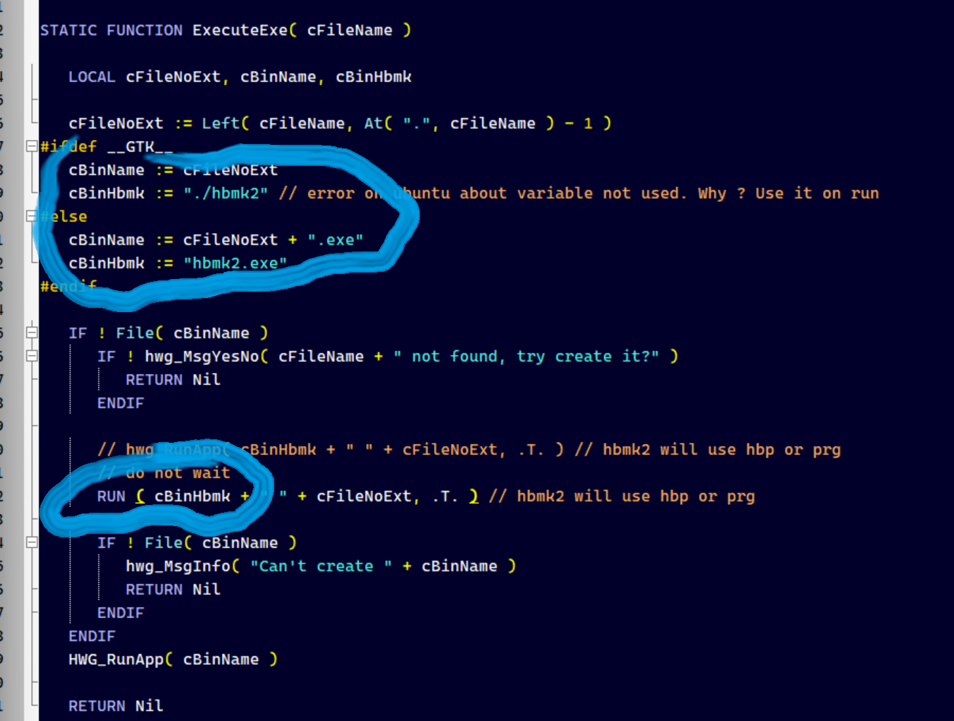 Na linquedição vai acusar falta de funções que não são do harbour: hwg_MsgInfo(), hwg_RunApp(), hwg_MsgYesNo()