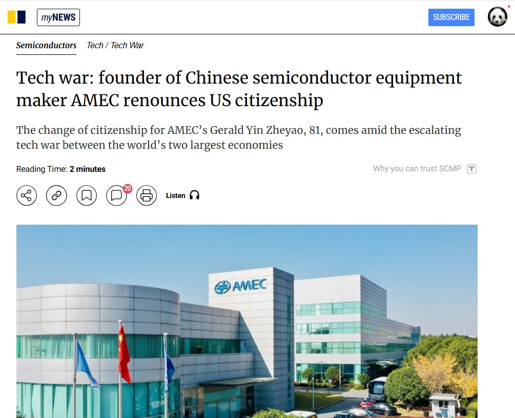 O fundador, presidente e CEO da AMEC, Gerald Yin Zheyao, renunciou à cidadania americana e restaurou sua nacionalidade chinesa, de acordo com o relatório anual da empresa publicado na sexta-feira.