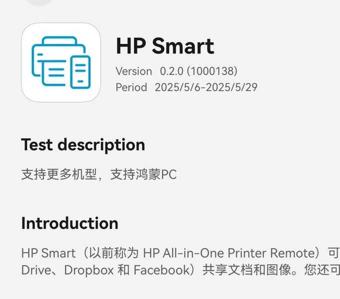 O HP Smart Print tem uma nova versão de teste no HarmonyOS NEXT. O destaque não são os novos recursos de teste, mas a descrição do teste, que adiciona suporte para "PCs HarmonyOS"!