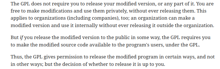 "But if you release the modified version to the public in some way, the GPL requires you to make the modified source code available to the program's users, under the GPL."