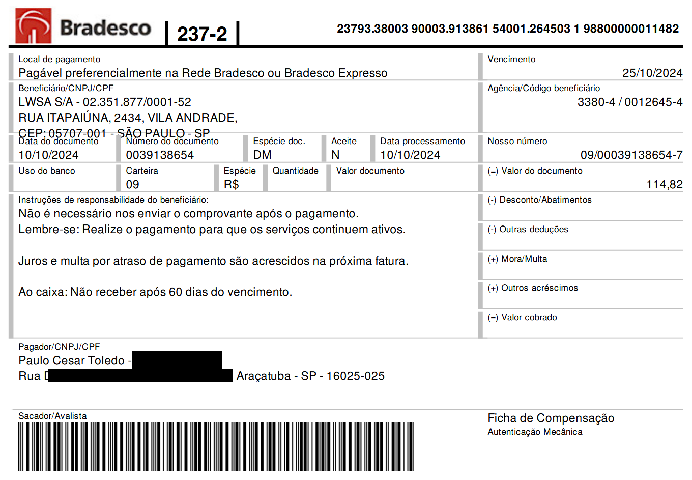 Digitável: 23793.38003 90003.834513 03001.264500 6 96060000011482