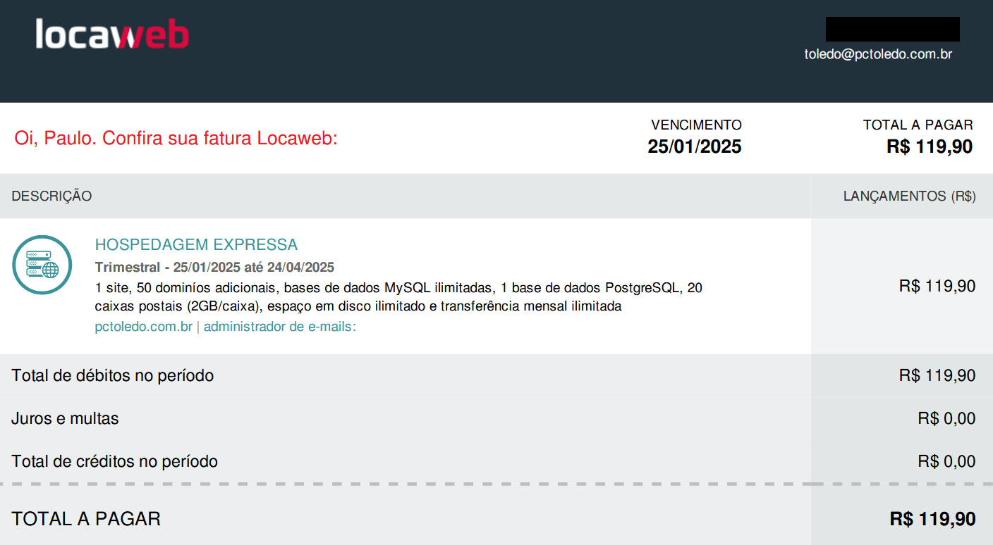 Só pra deixar avisado, aumento de 5.19% na próxima fatura.Em breve, a fatura para renovação dos seus serviços conosco será fechada e encaminhada para este e-mail.