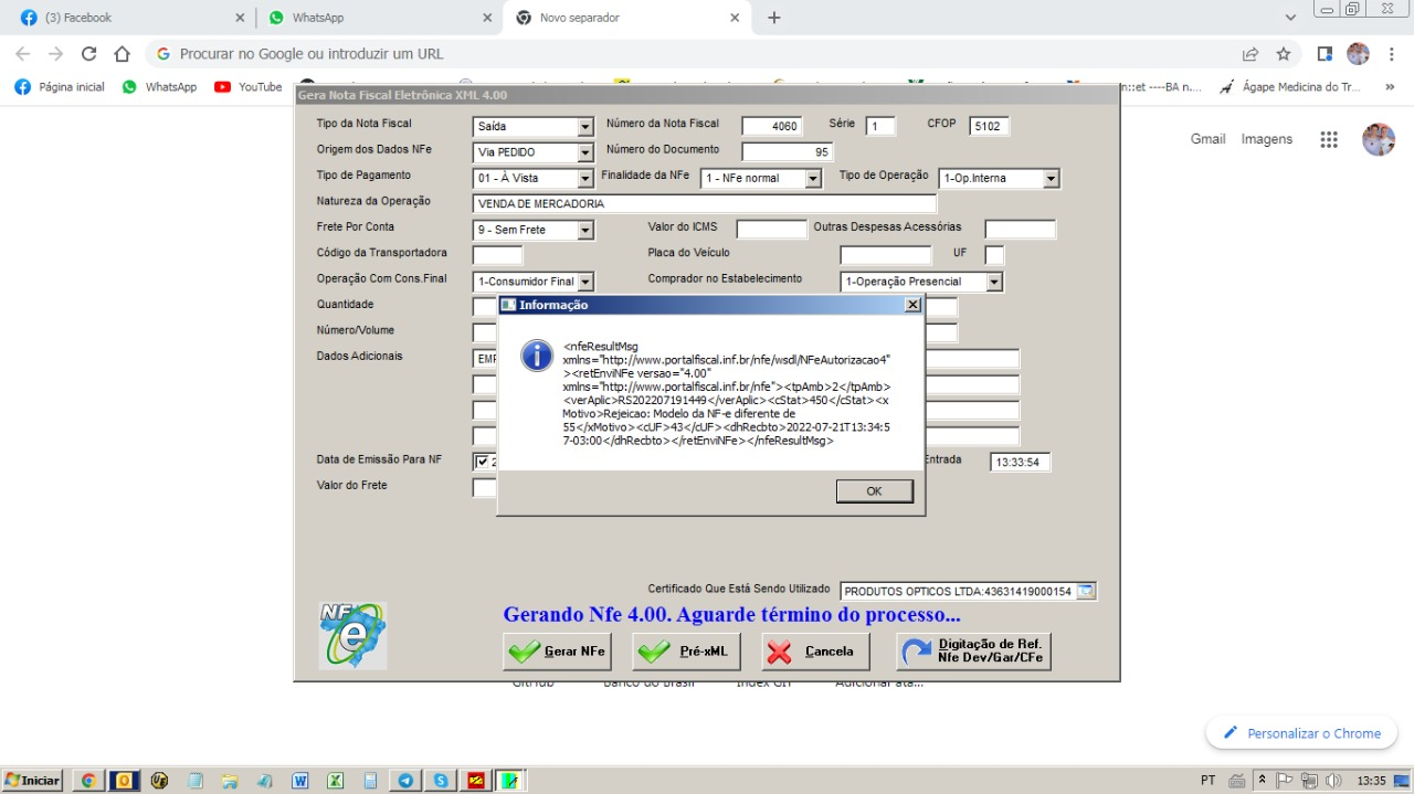 "MODELO DE NFE DIFERENTE DE 55"