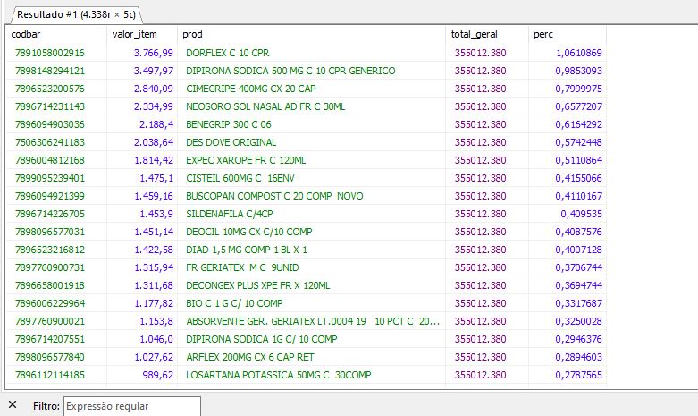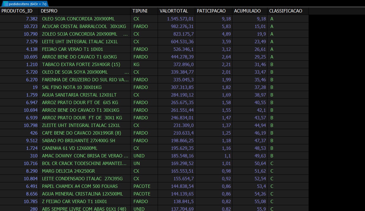 Estou desenvolvendo uma query para relatório da curva abc dos produtos. Estou enfrentenado dificuldade para fazer o acumulado dos percentuais para depois a aplicar a classificação "A", "B" ou "C". Se algum tiver alguma idéia fico grato.